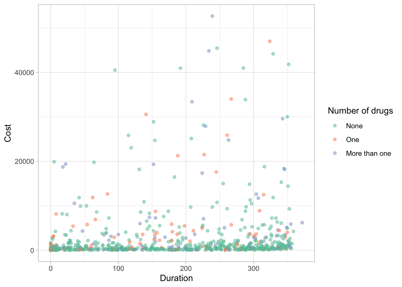 heart_disease |>ggplot(aes(x = Duration, y = Cost, color = Drugs)) +geom_point(alpha =0.5) +scale_color_brewer(palette ="Set2") +labs(x ="Duration", y ="Cost",color ="Number of drugs") +theme_light()