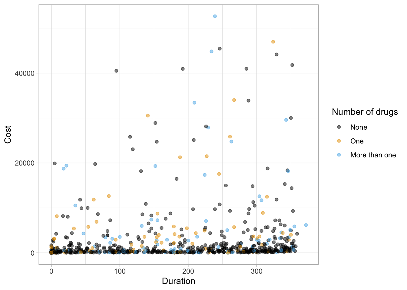 heart_disease |>ggplot(aes(x = Duration, y = Cost, color = Drugs)) +geom_point(alpha =0.5) +# call the function directly from the package using `::` instead of library(ggthemes) ggthemes::scale_color_colorblind() +labs(x ="Duration", y ="Cost",color ="Number of drugs") +theme_light()