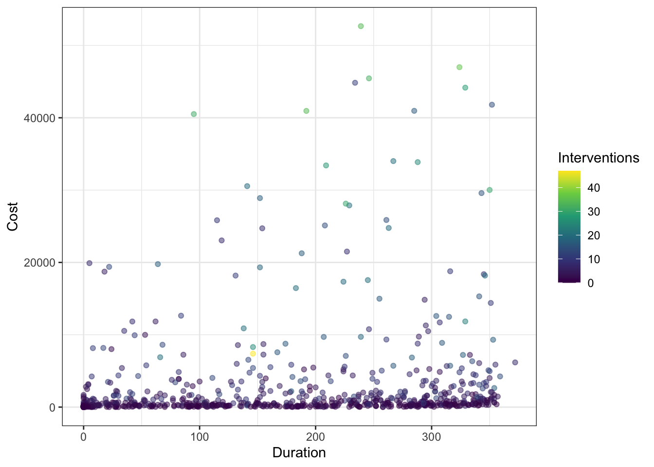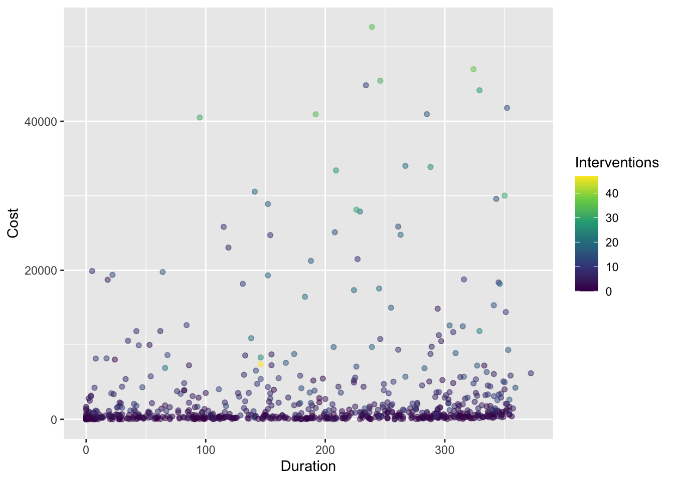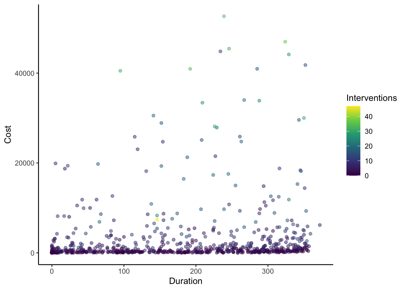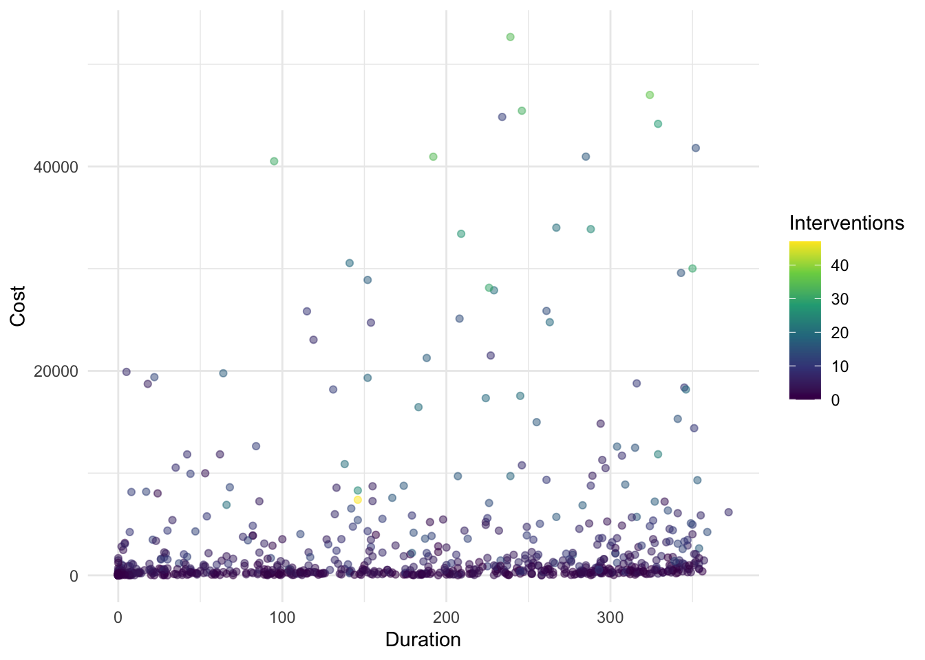 heart_disease |>ggplot(aes(x = Duration, y = Cost, color = Interventions)) +geom_point(alpha =0.5) +scale_color_viridis_c() +labs(x ="Duration", y ="Cost",color ="Interventions") +theme_light()