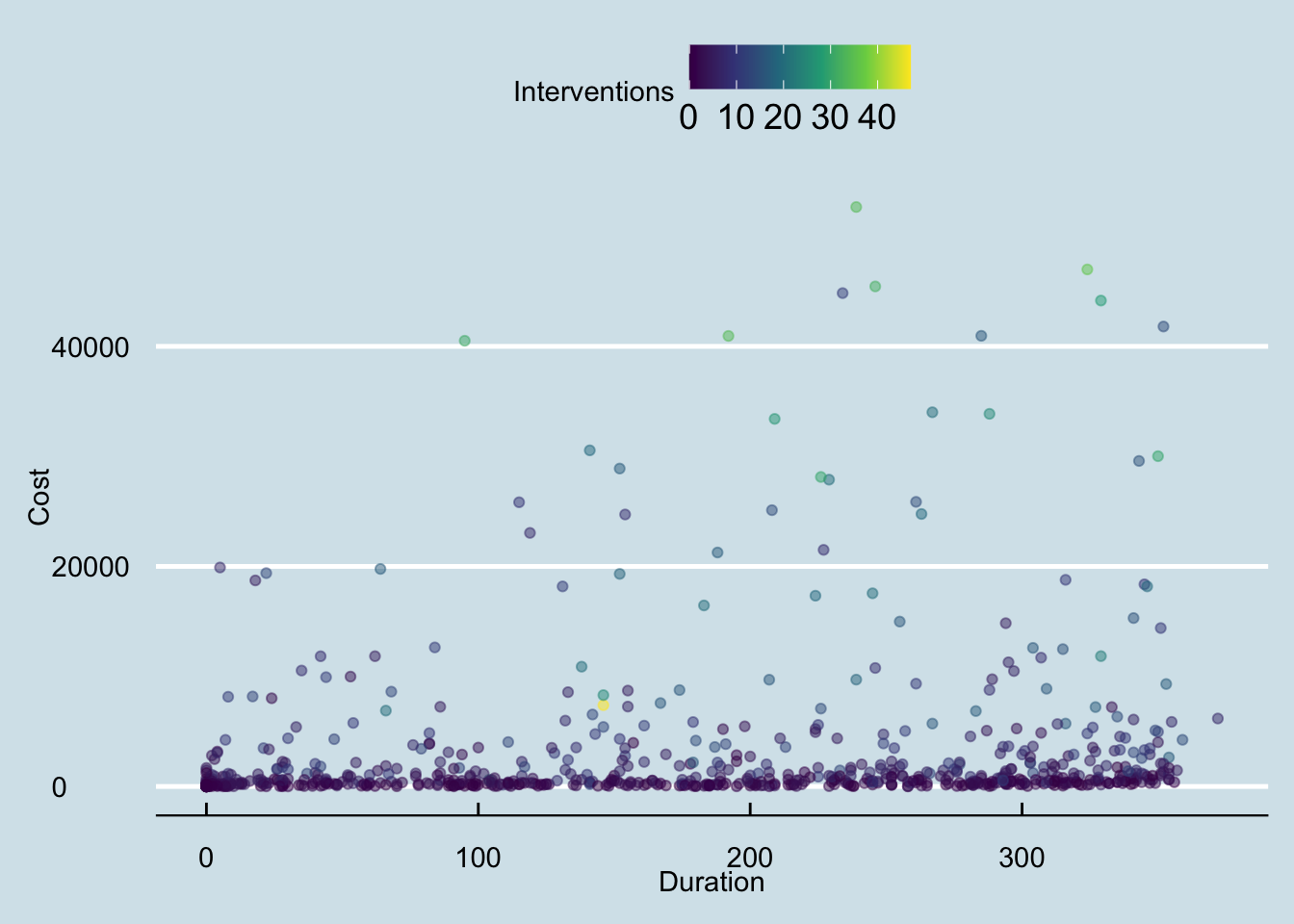 heart_disease |>ggplot(aes(x = Duration, y = Cost, color = Interventions)) +geom_point(alpha =0.5) +scale_color_viridis_c() +labs(x ="Duration", y ="Cost",color ="Interventions") +theme_gray()