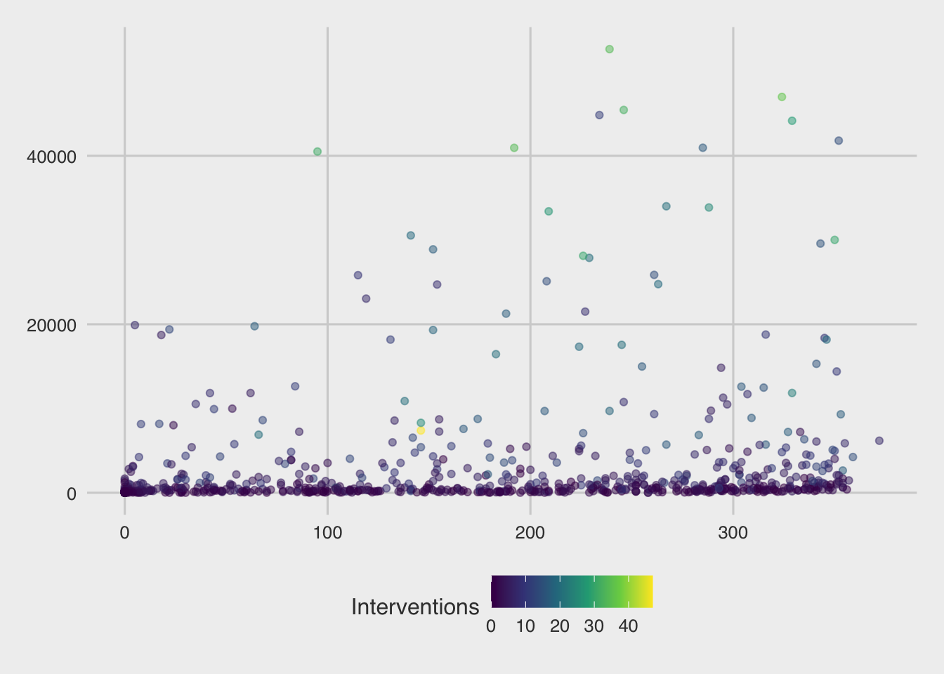 In terms of displaying color from low to high, the viridis scales are excellent choices (and are also color-blind friendly!). For instance, we can map another quantitative variable (Interventions) to the color: