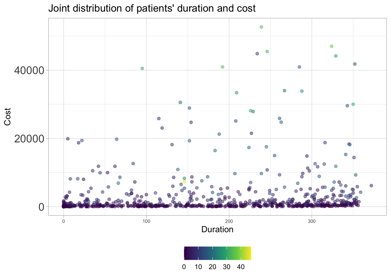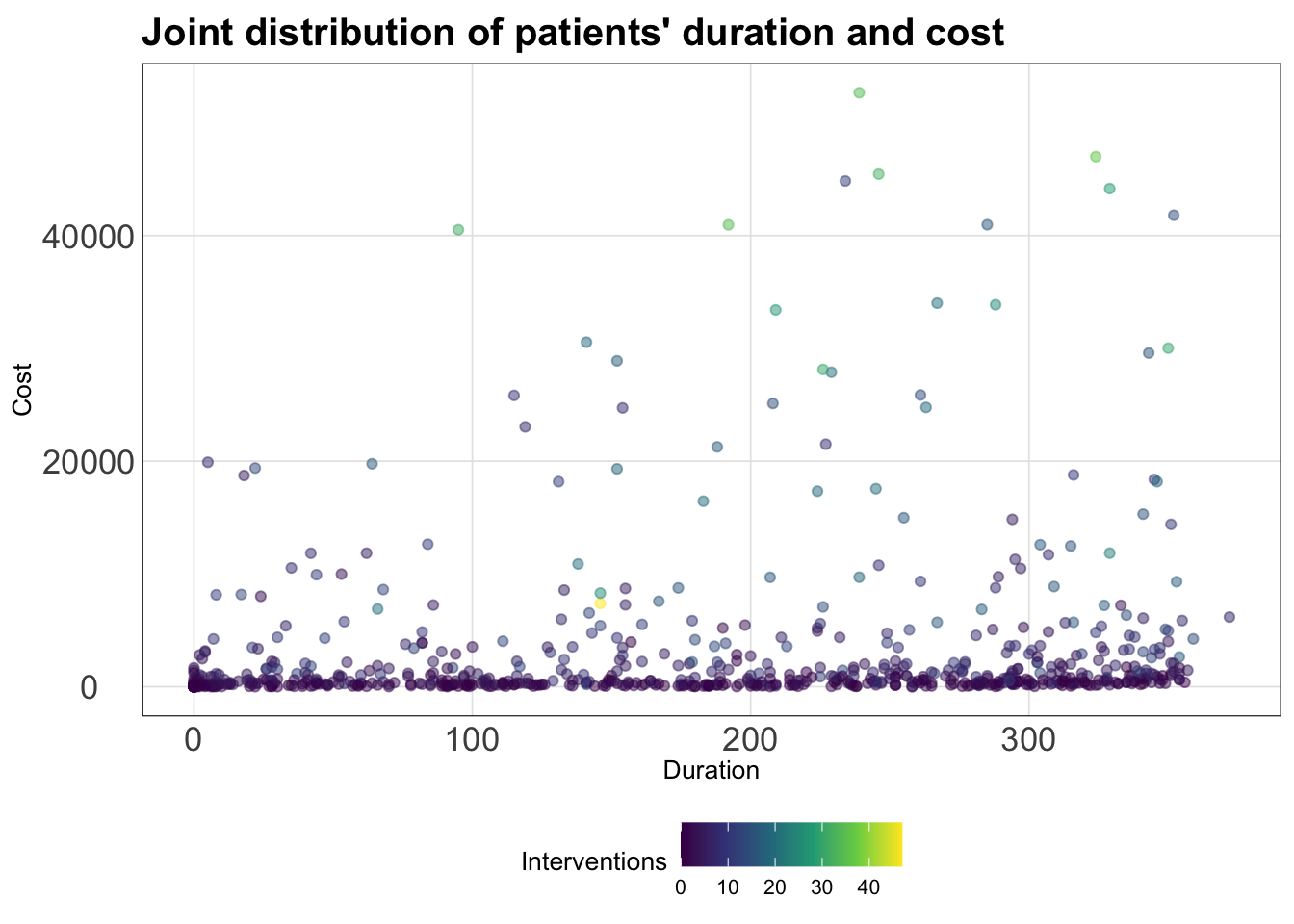heart_disease |>ggplot(aes(x = Duration, y = Cost, color = Interventions)) +geom_point(alpha =0.5) +scale_color_viridis_c() +labs(x ="Duration", y ="Cost",title ="Joint distribution of patients' duration and cost",color ="Interventions") +theme_light() +theme(legend.position ="bottom",legend.title =element_blank(),axis.text.y =element_text(size =14),axis.text.x =element_text(size =6))