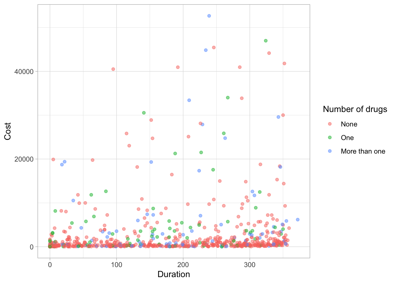 heart_disease |>ggplot(aes(x = Duration, y = Cost, color = Drugs)) +geom_point(alpha =0.5) +labs(x ="Duration", y ="Cost",color ="Number of drugs") +theme_light()
