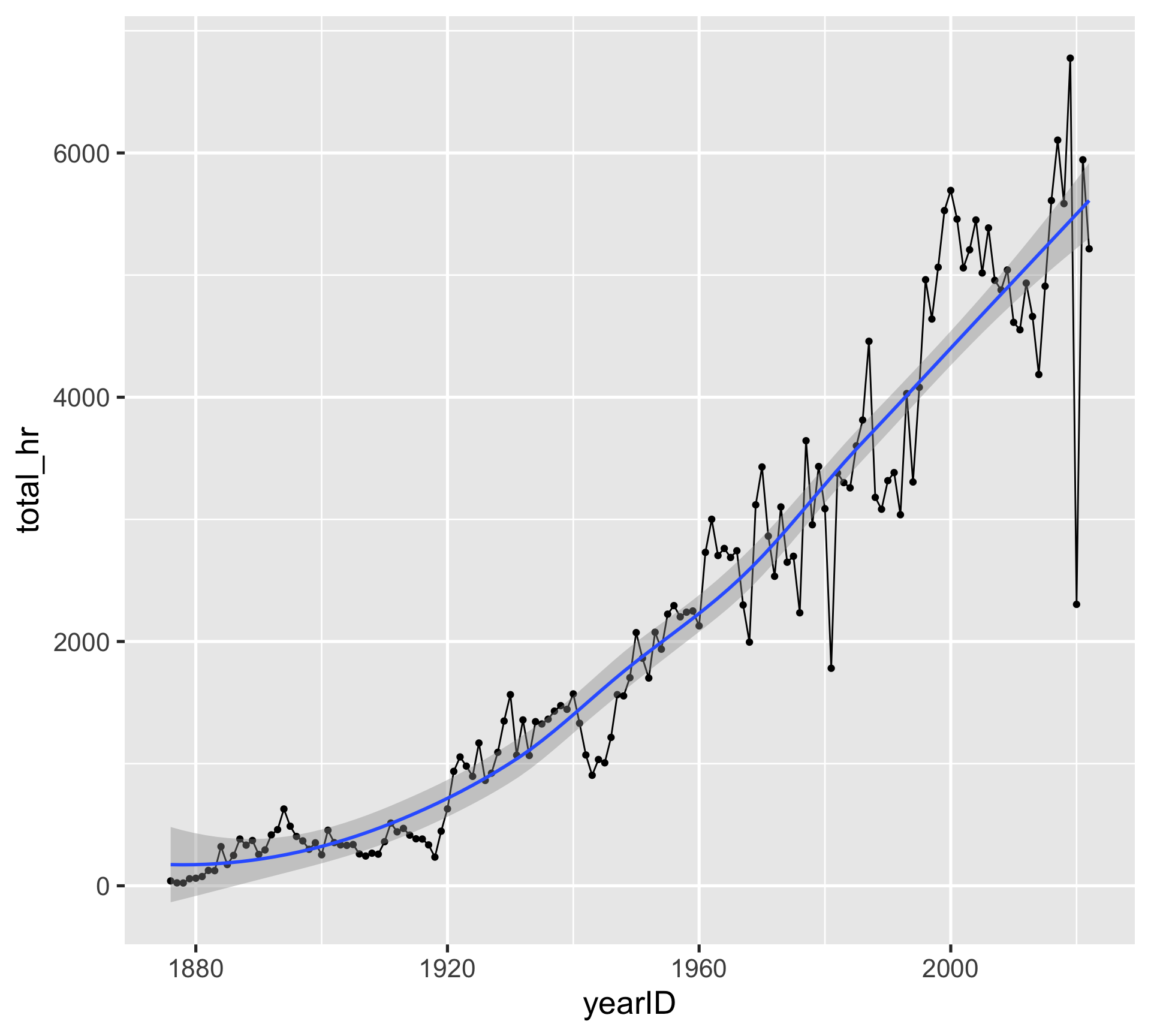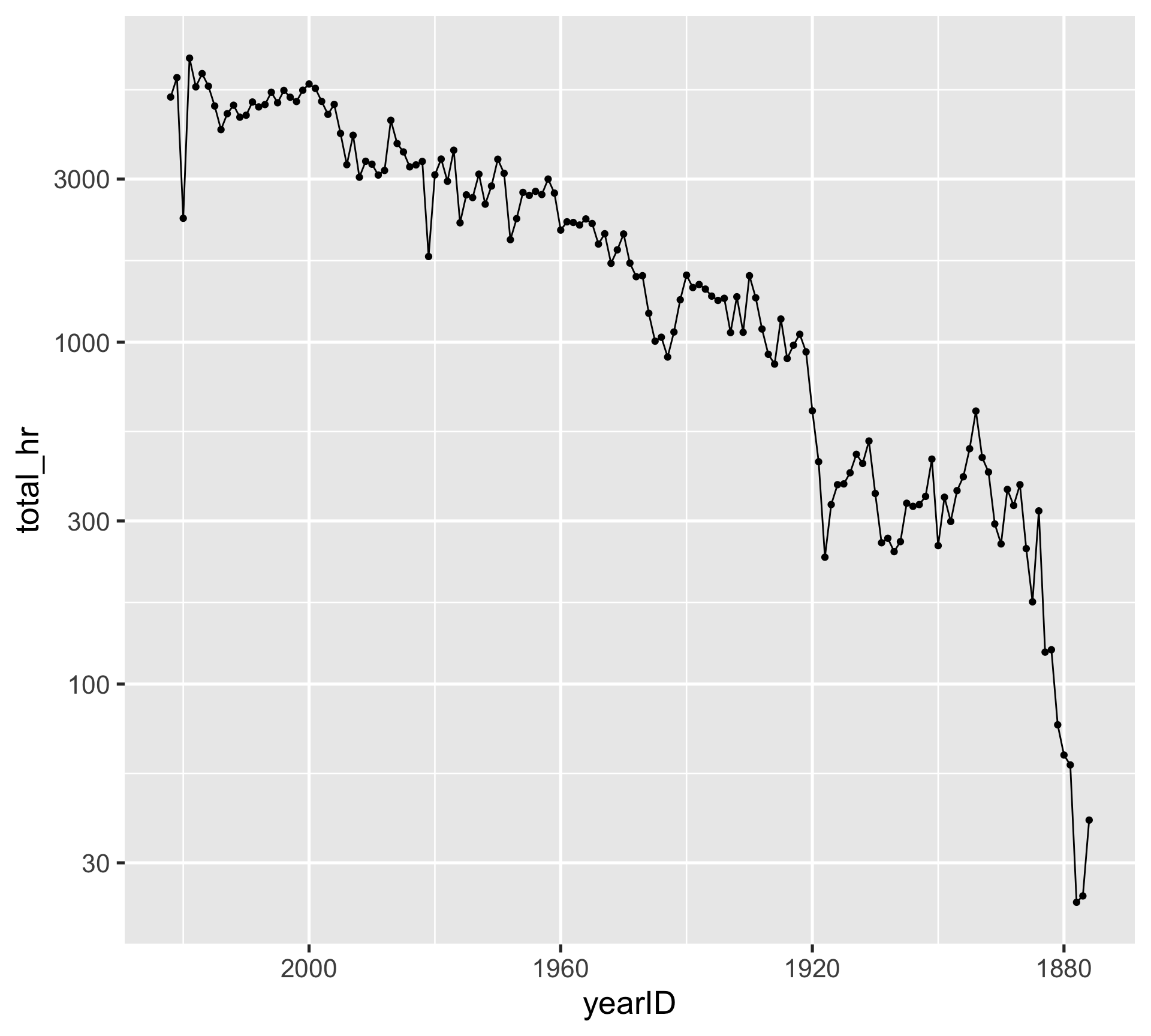 Yearly MLB batting statistics from Lahman with tidyverse: