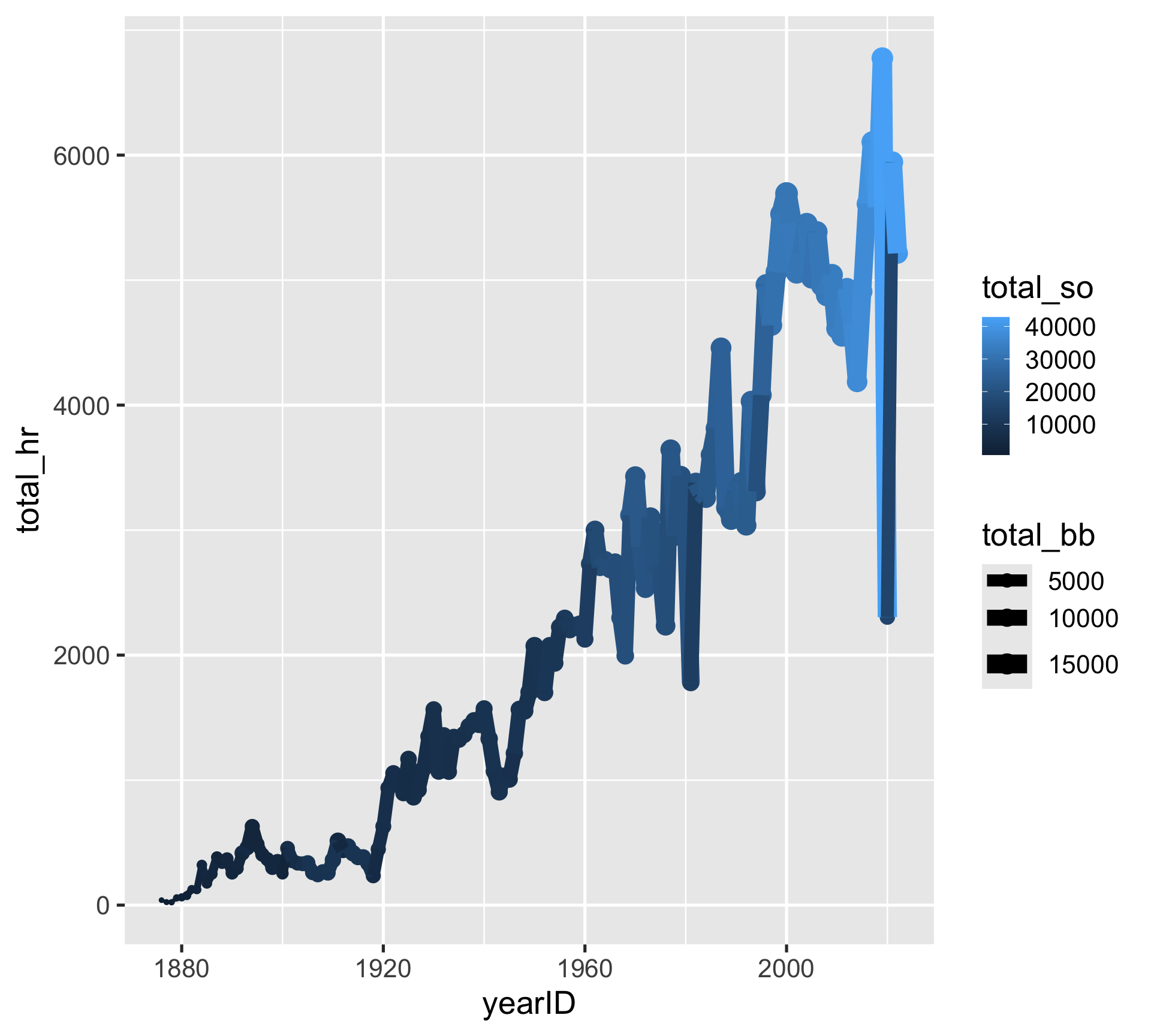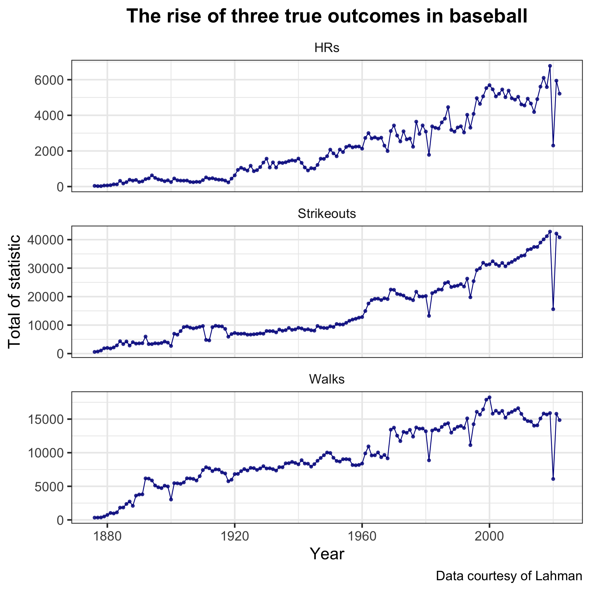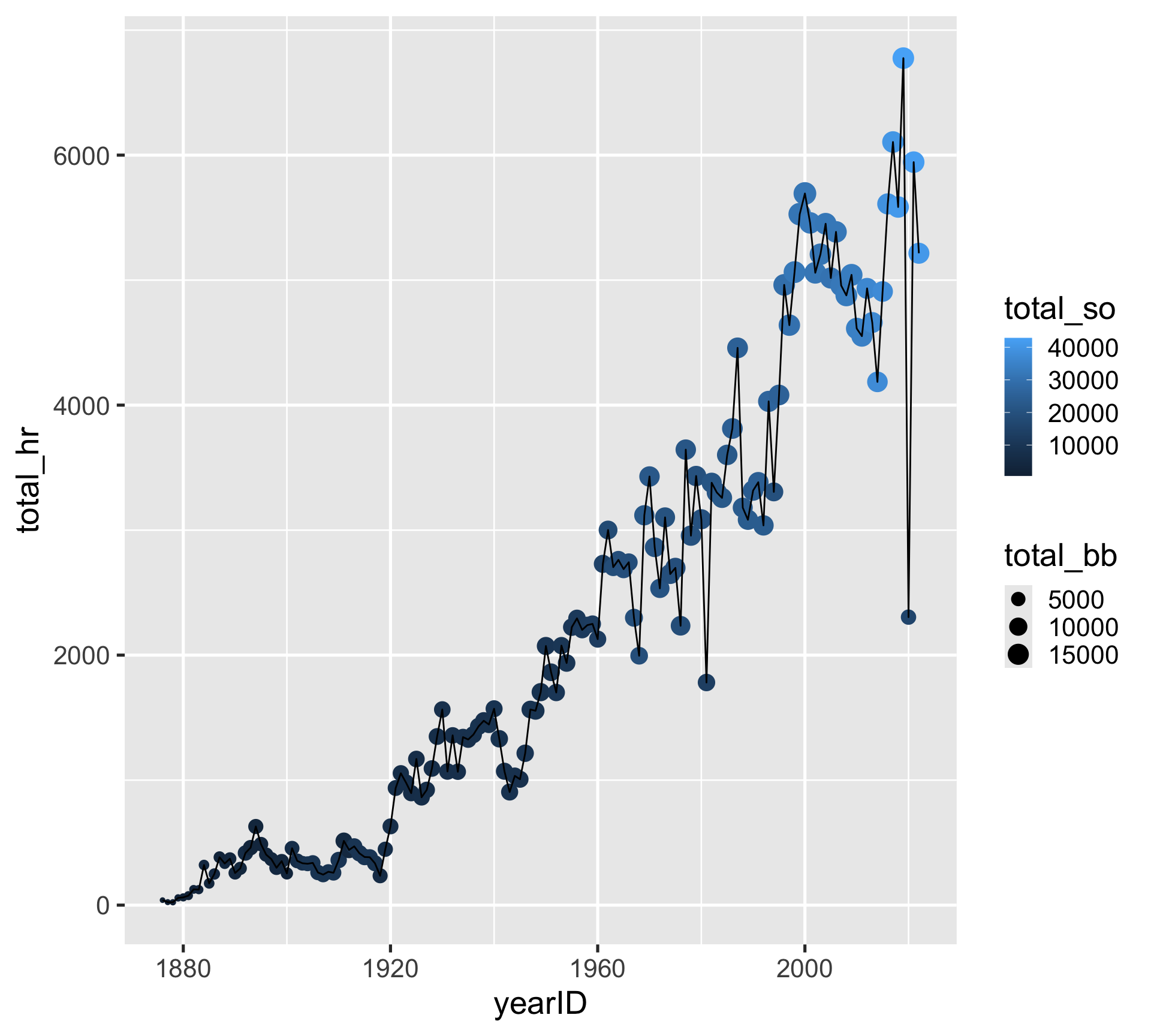 select(yearID, HRs = total_hr, Strikeouts = total_so, Walks = total_bb) |> # renaming while also selecting