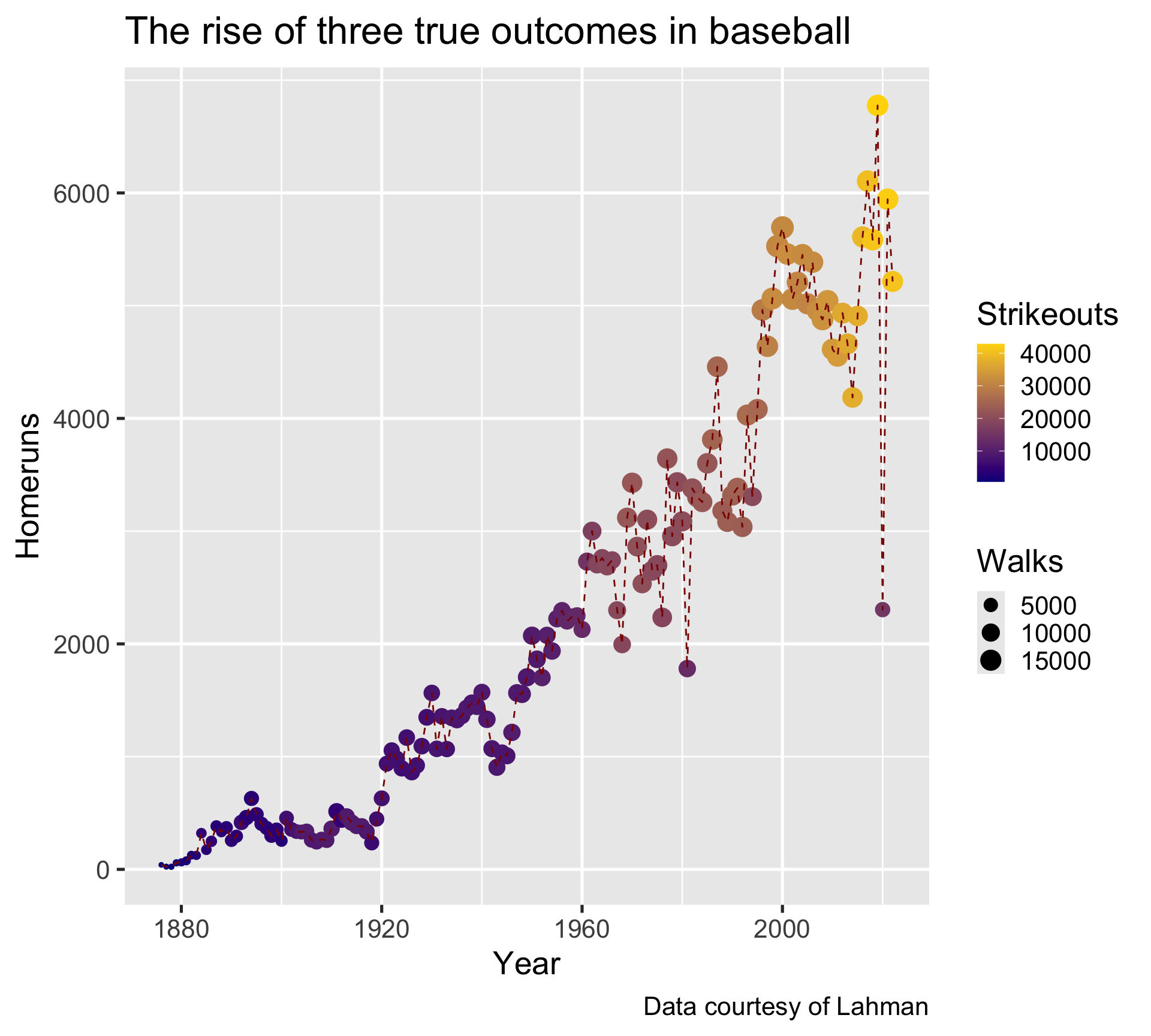 How about creating three separate plots for home runs, strikeouts, and walks, with each mapped to the y-axis?