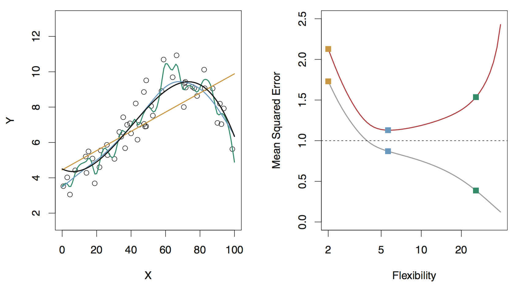 “Best” model minimizes the test-set MSE, where the true MSE can be decomposed into \({\rm MSE} = {\rm (Bias)}^2 + {\rm Variance}\)