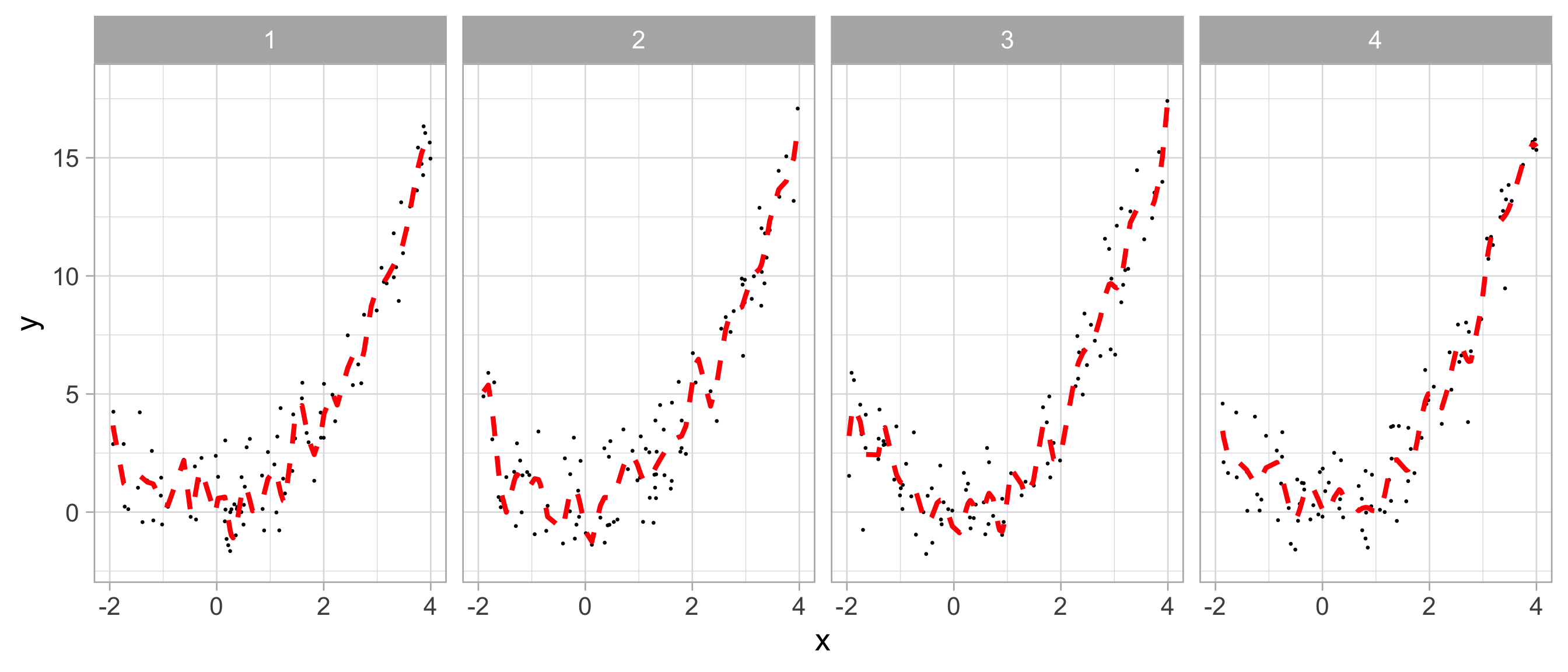 Data are generated from a smoothly varying non-linear model (shown in black), with random noise added: \[ Y = f(X) + \epsilon \]
