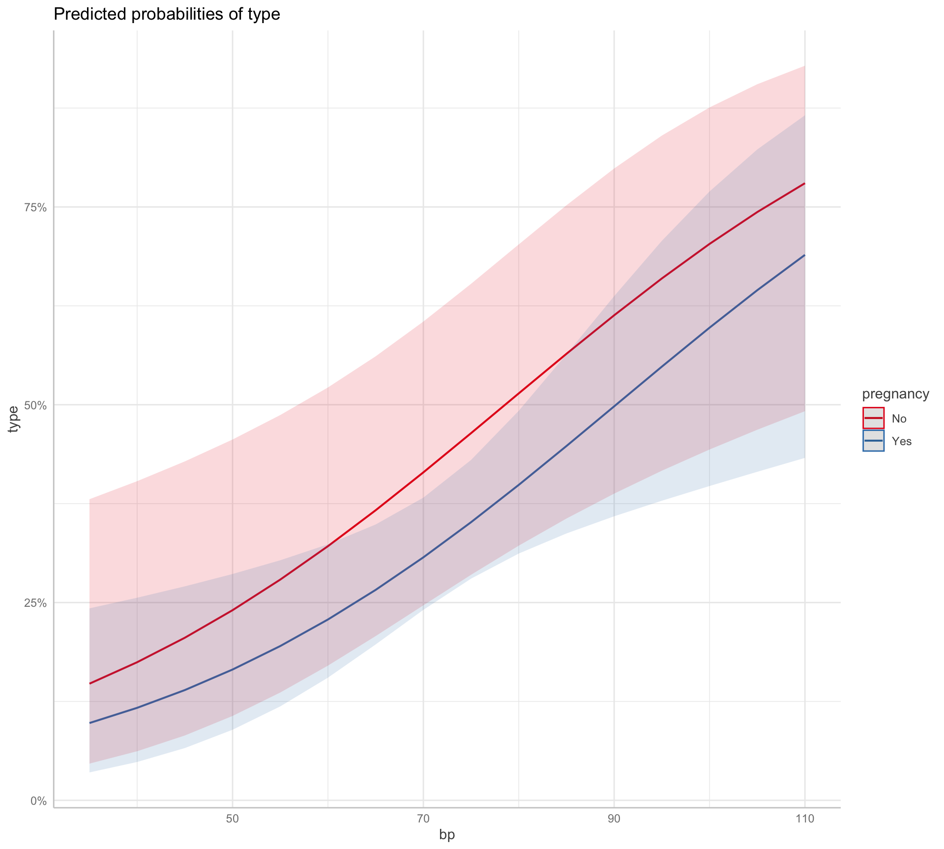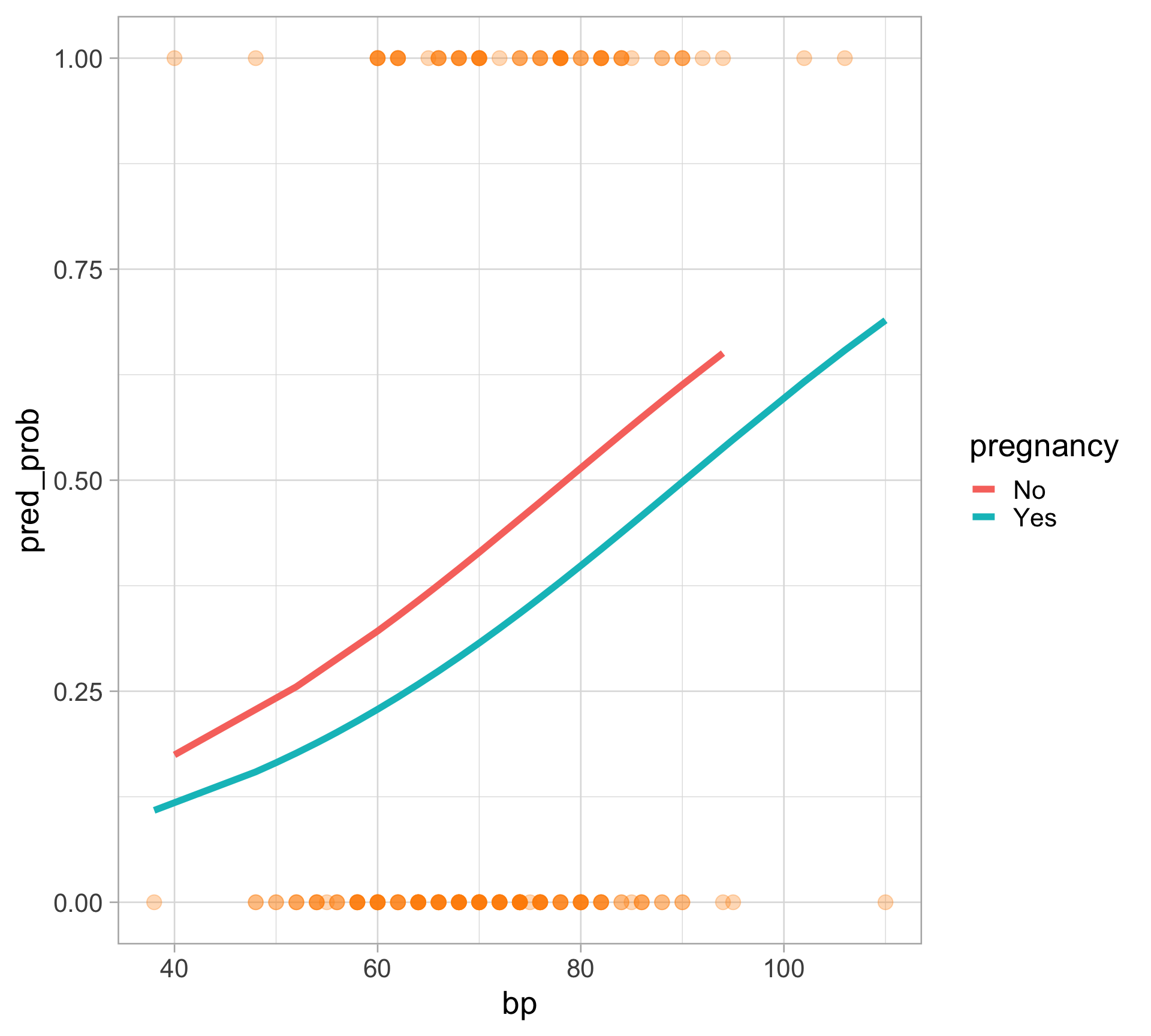 glm function, but specify the family is binomialtidy() function in the broom packagepima_logit <- glm(type ~ pregnancy + bp, data = pima, family = binomial)