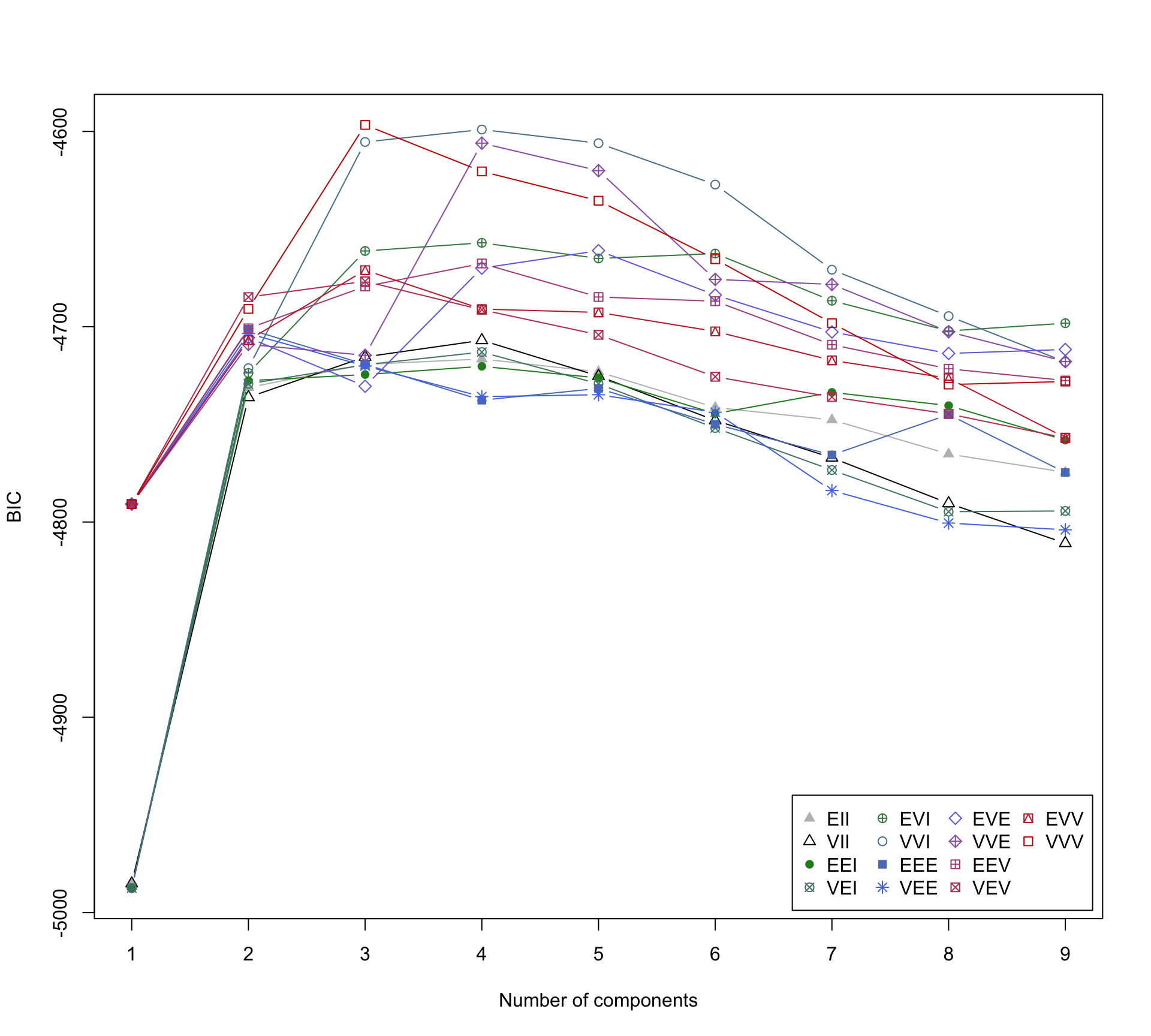 Use Mclust() function to search over 1 to 9 clusters (default) and the different covariance constraints (i.e. models)