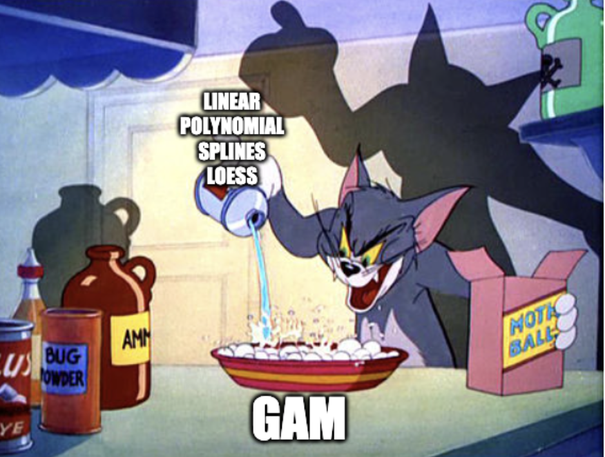 Like GLMs, a GAM specifies a link function \(g()\) and a probability distribution for the response \(Y\)
