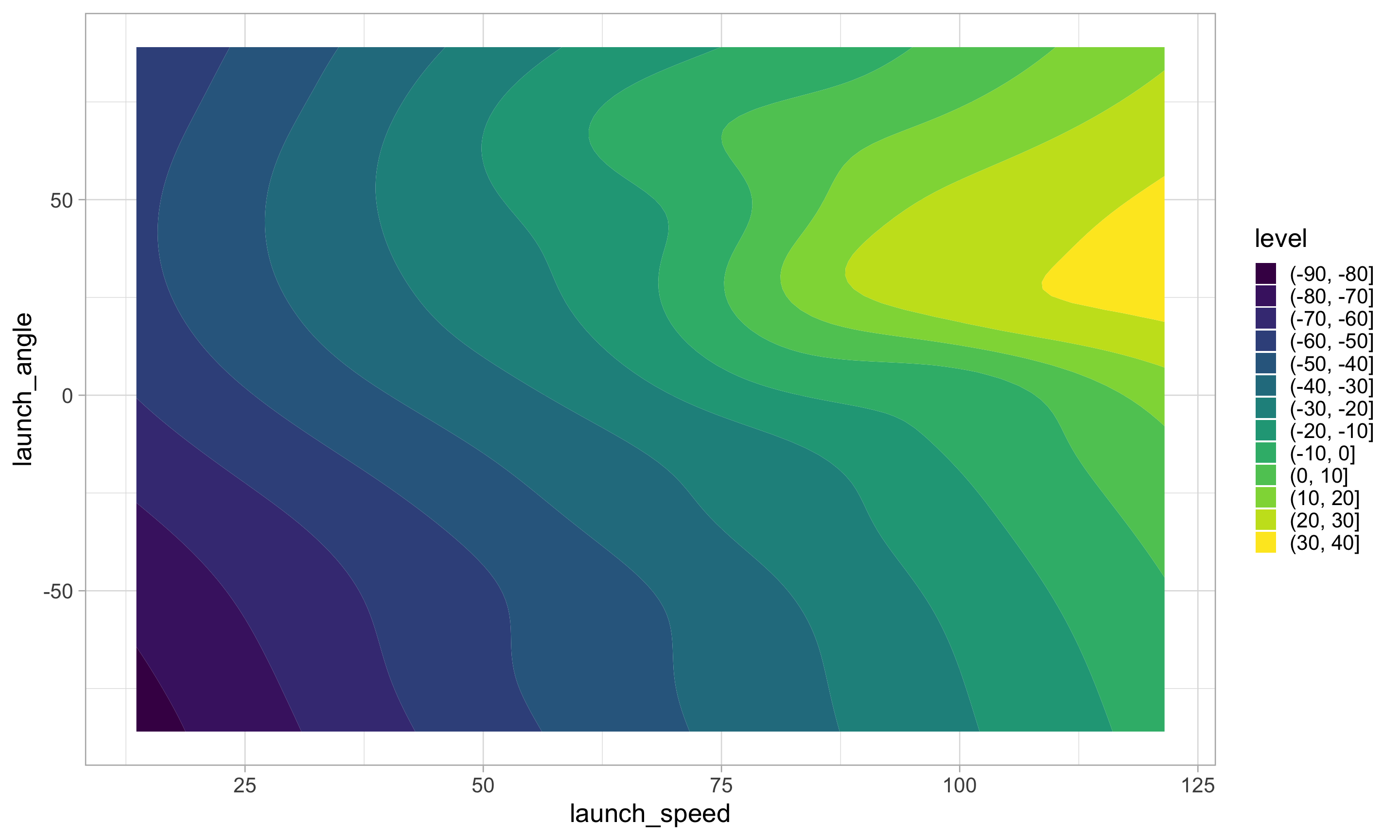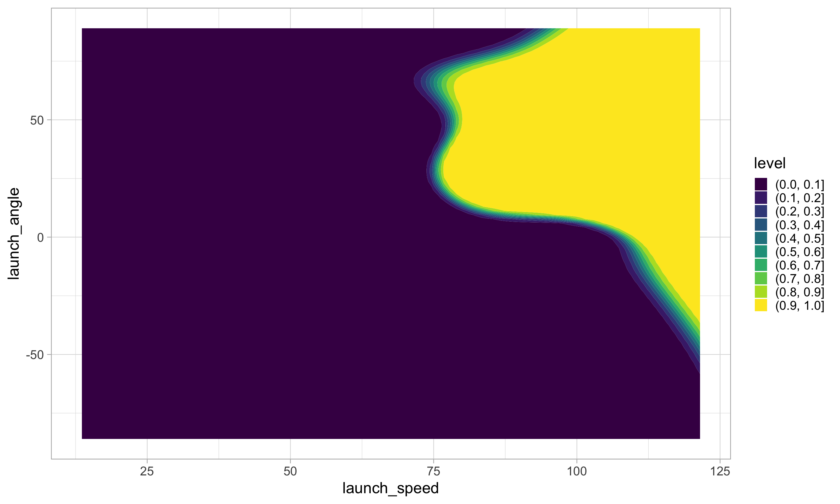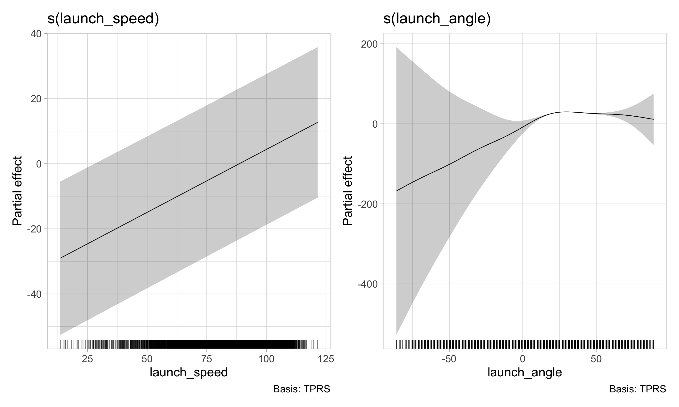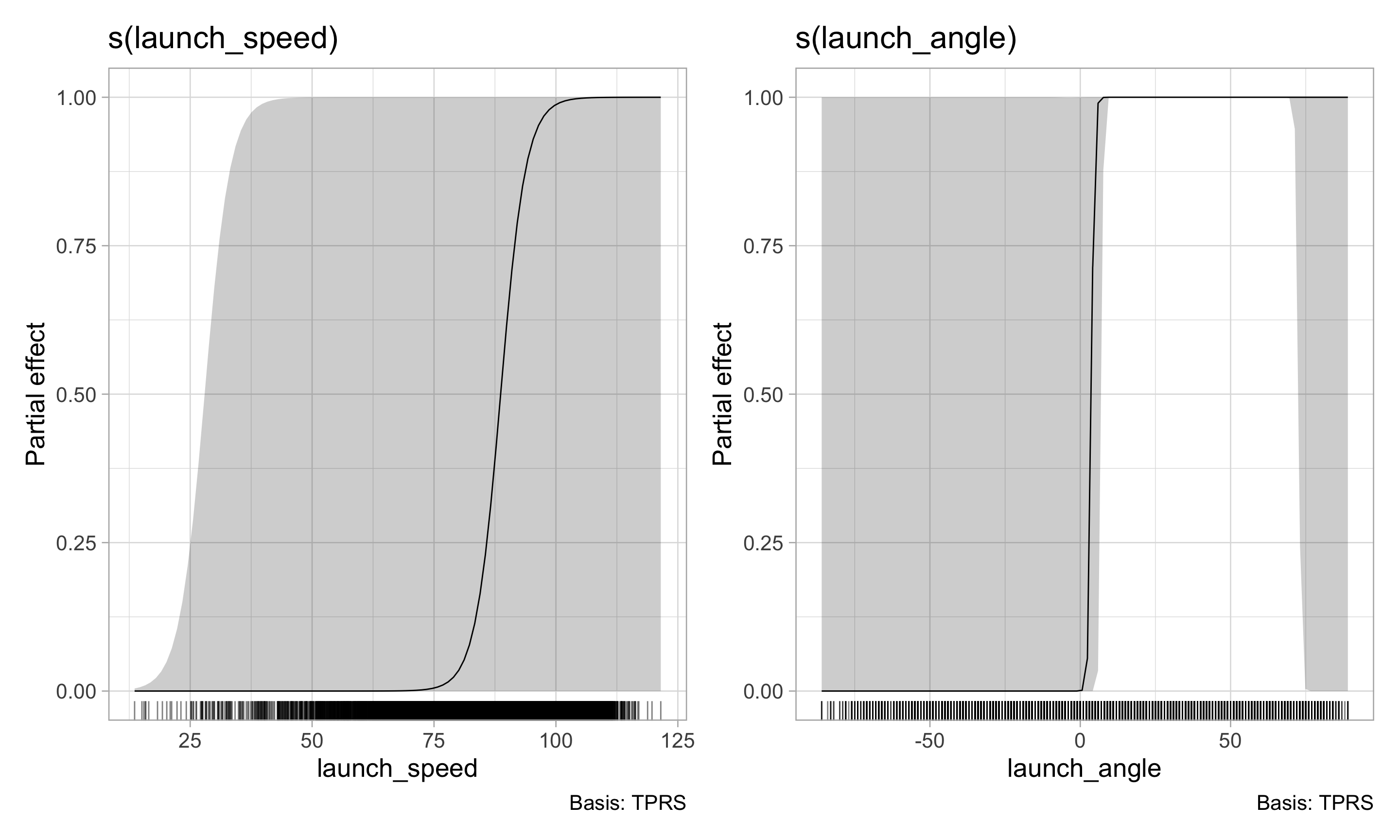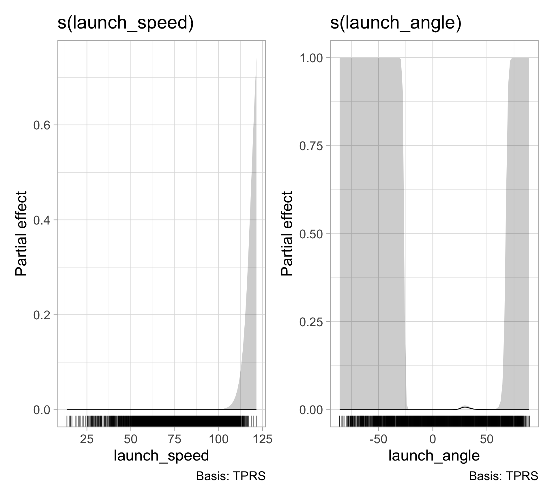 \log \left( \frac{p_{\texttt{is_hr}}}{1 - p_\texttt{is_hr}} \right) = \beta_0 + s_1 (\texttt{launch_speed}) + s_2 (\texttt{launch_angle})\] where \(p_\texttt{is_hr}\) is the probability of a home runmgcv performs hypothesis tests for the smooth terms — these are roughly the equivalent of an \(F\)-test for dropping each term