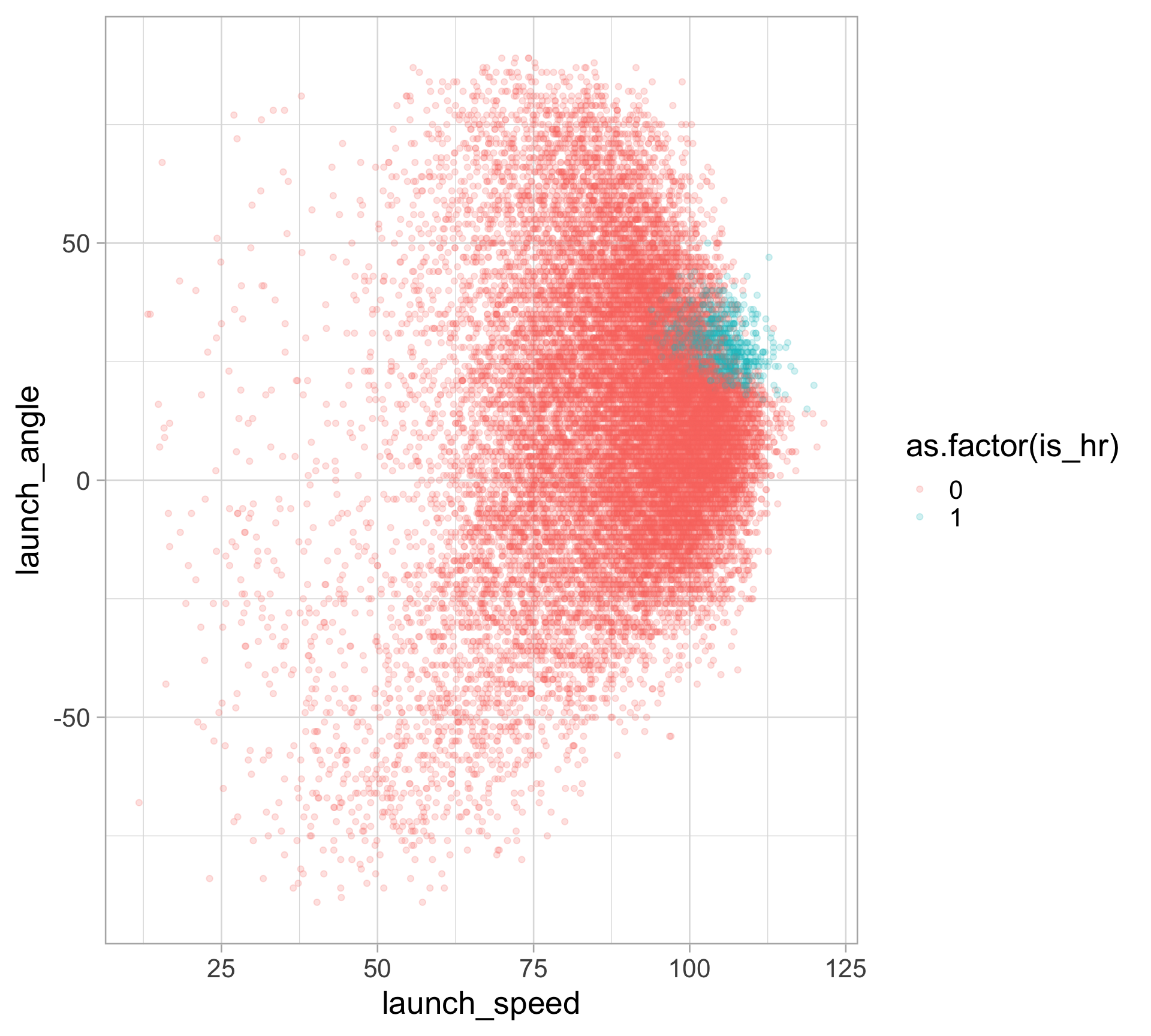 There is a sweet spot of launch_angle (mid-way ish) and launch_speed (relatively high) where almost all HRs occur