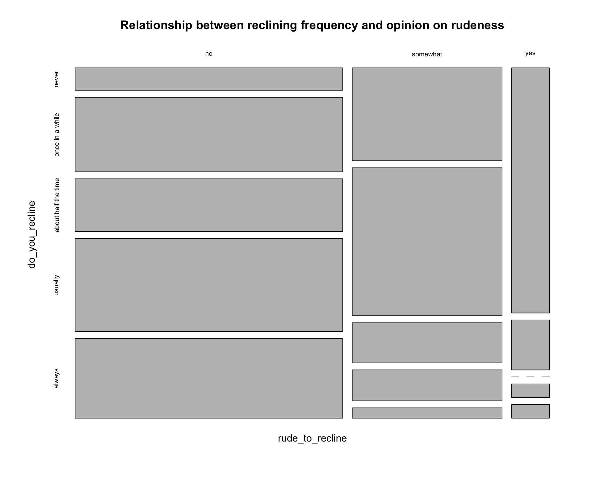 mosaicplot(main = "Relationship between reclining frequency and opinion on rudeness")