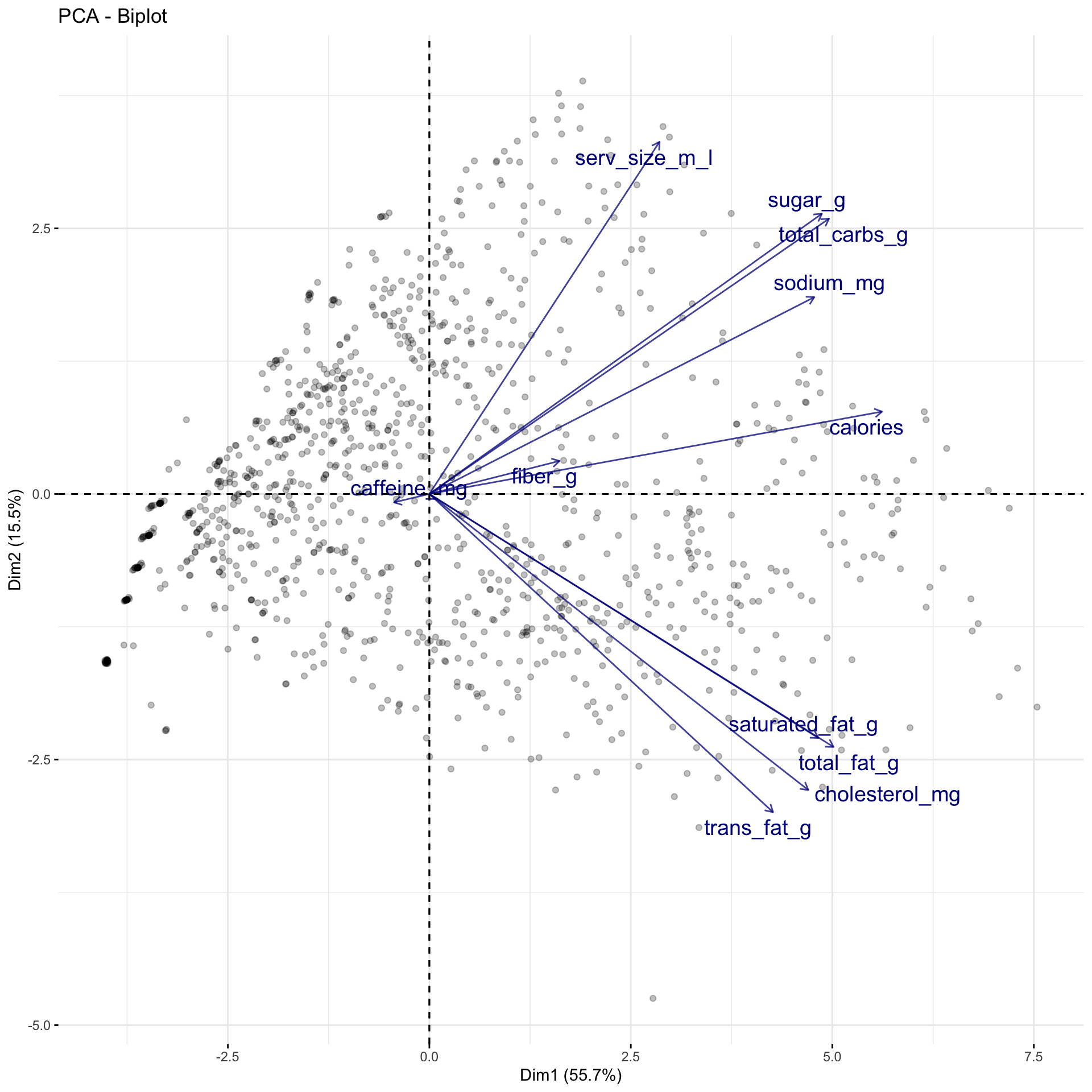 • \(90^{\circ}\) (right angle): uncorrelated (e.g. serv_size_m_l and saturated_fat_g)