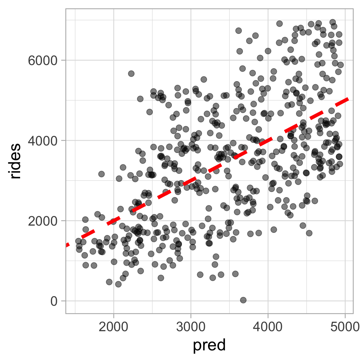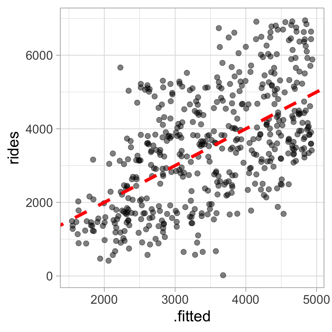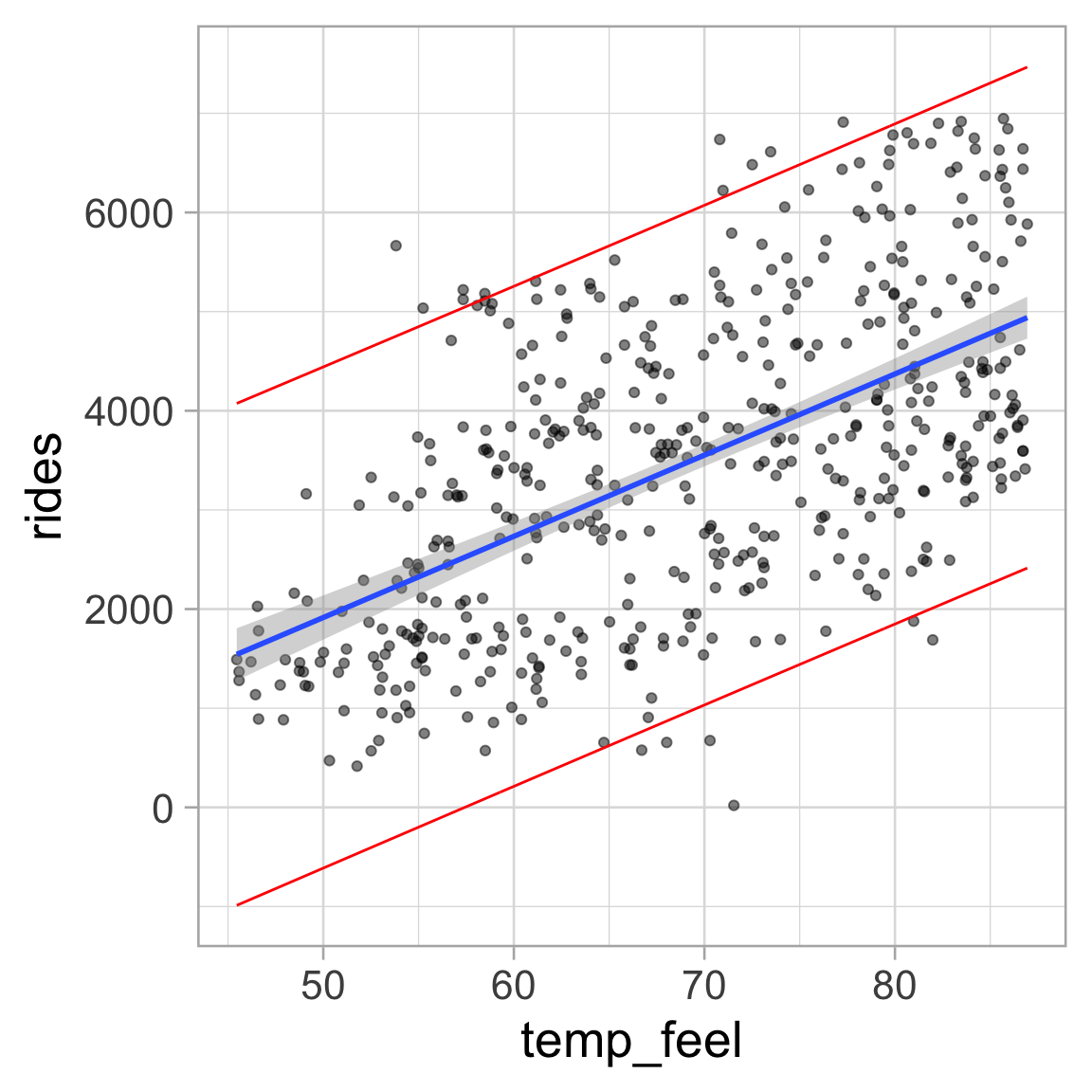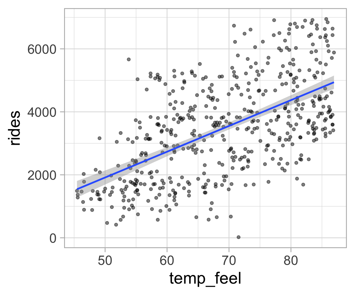 OLS line: \(\ \ \small \widehat{\text{Rides}} = -2179.27 + 81.88 \ \text{Temperature}\)