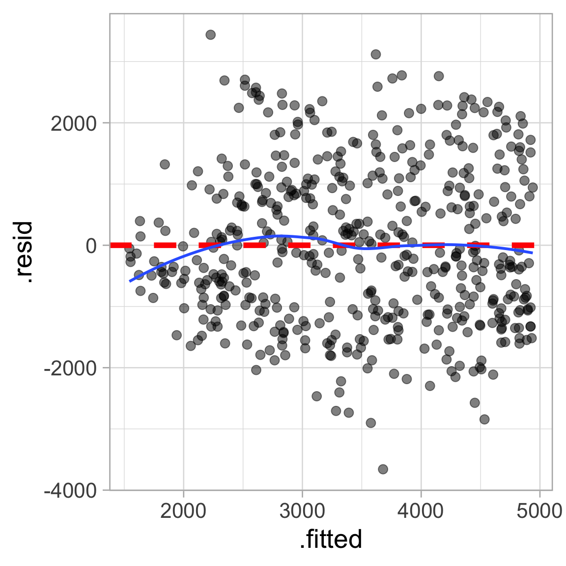 augment() adds various columns from model fit we can use in plotting for model diagnostics