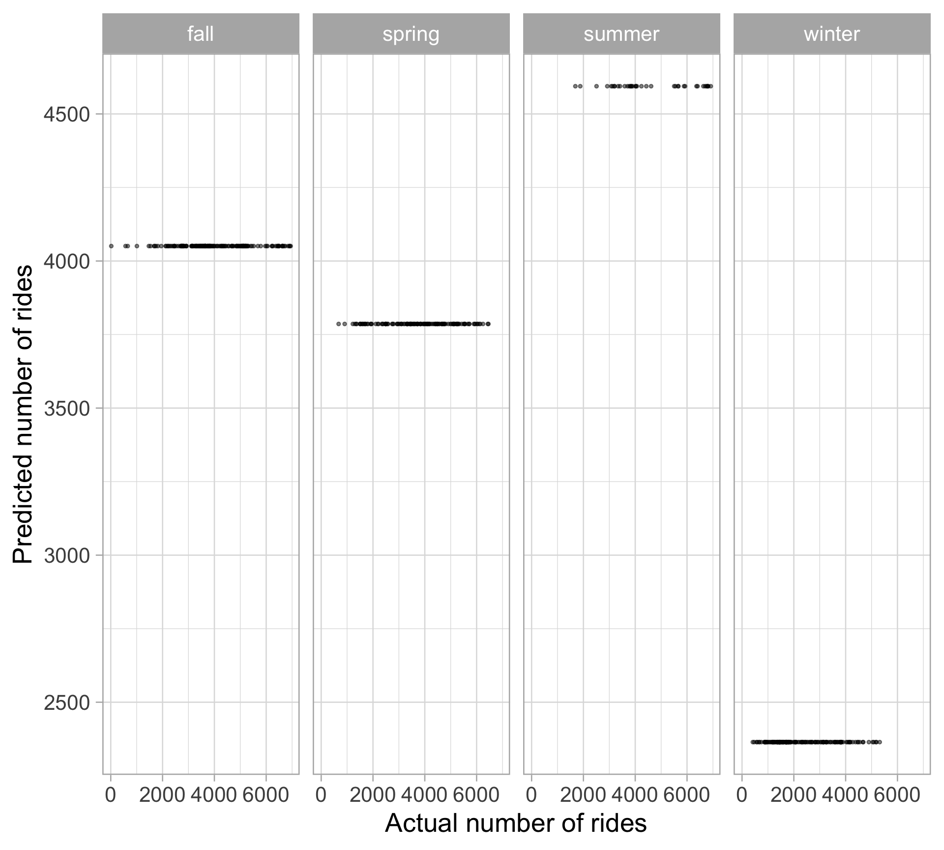 \[\widehat{\text{Rides}} = 4050.7 - 264.7 \ I_{\texttt{spring}} + 543.5 \ I_{\texttt{summer}} - 1686.3 \ I_{\texttt{winter}}\]