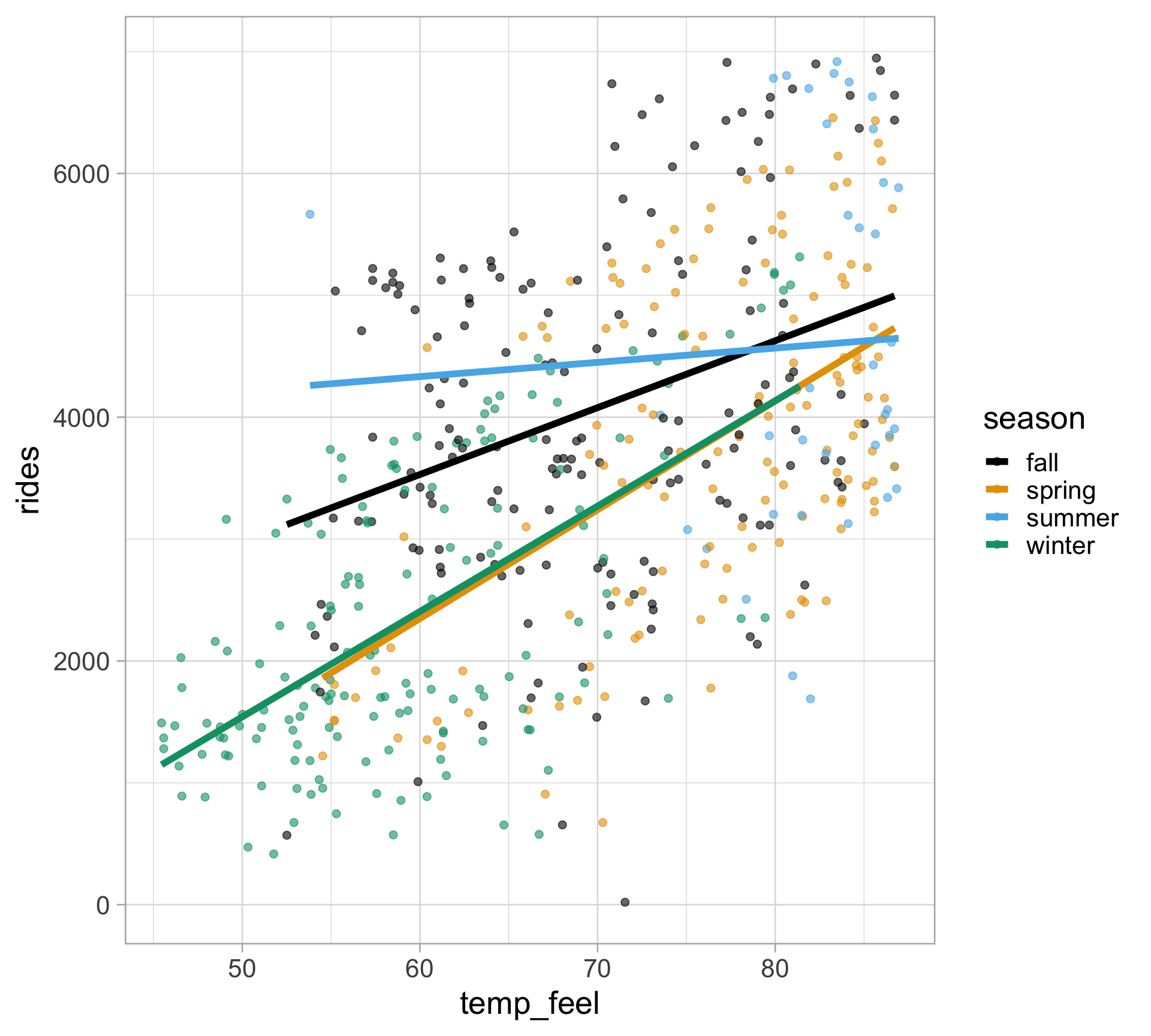 rides by the season (4 levels: spring, summer, fall, winter)We are changing the intercept of our regression line by including a categorical variable