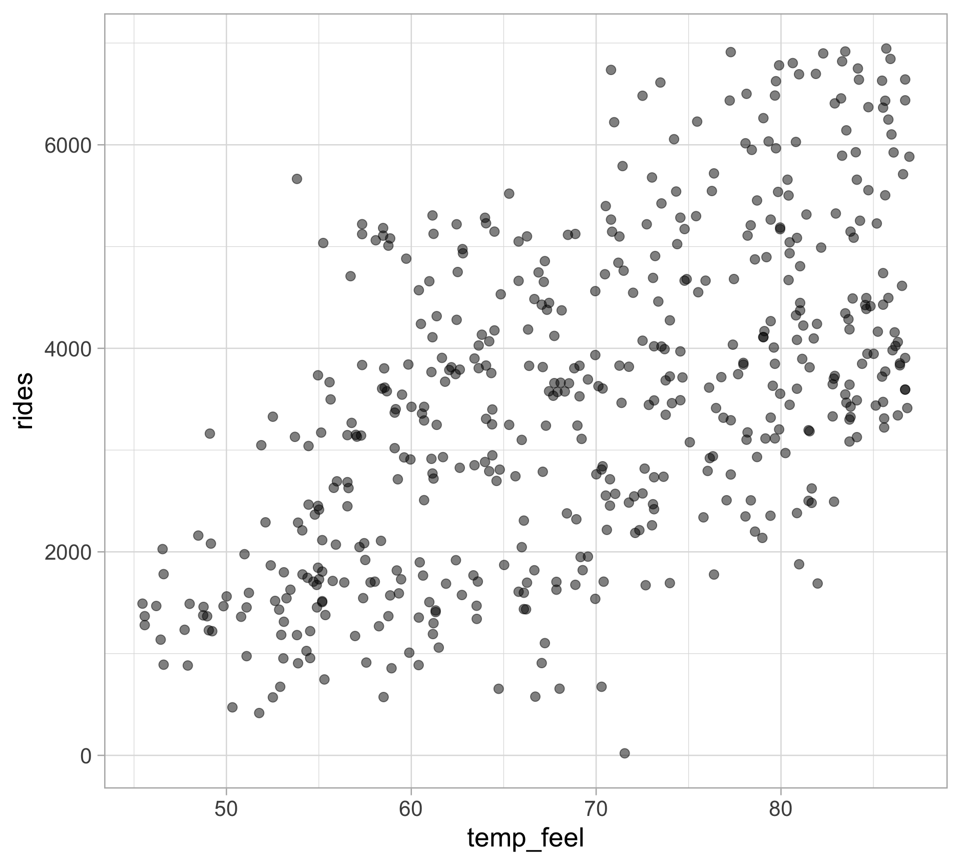 lm(formula = rides ~ temp_feel, data = bikes)