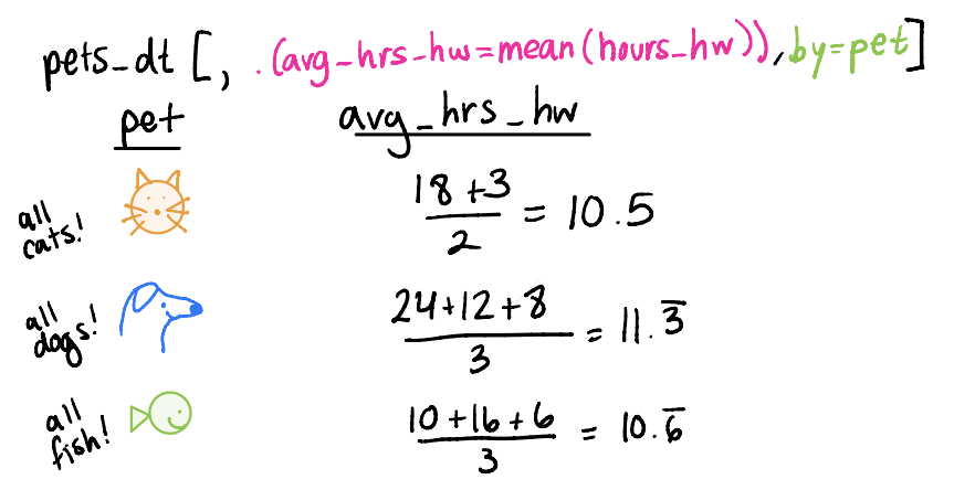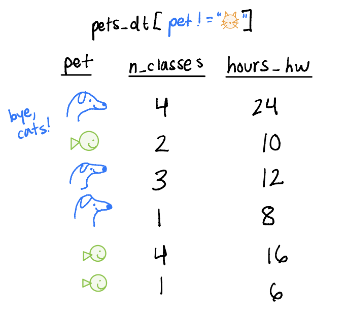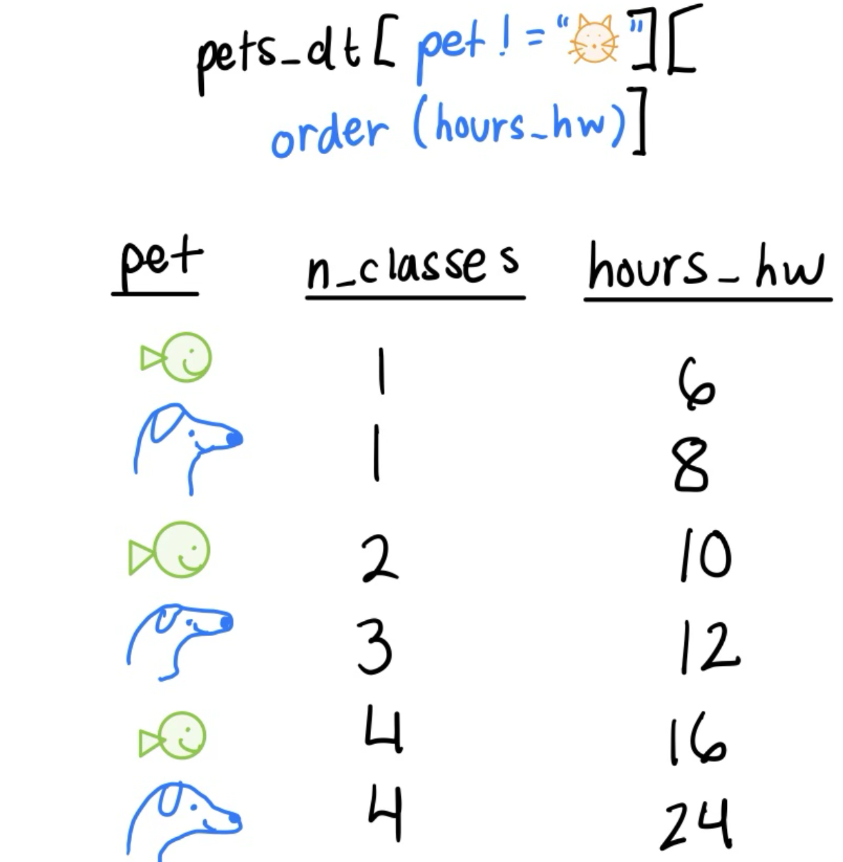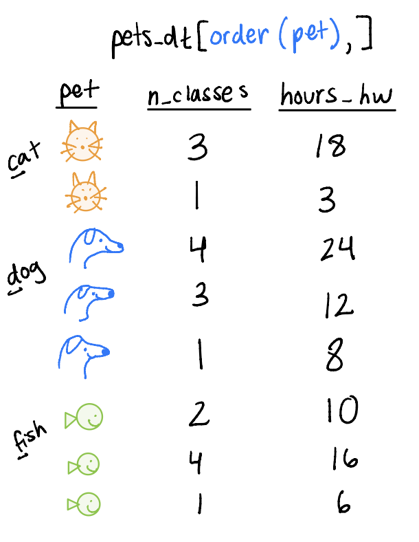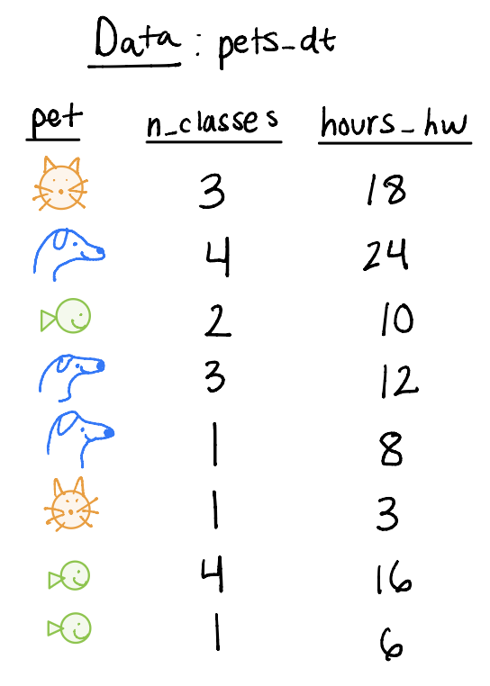 What if we wanted to pair multiple of the six main verbs together? For example, filter pets_dt to remove the cats and then arrange by hours_hw?