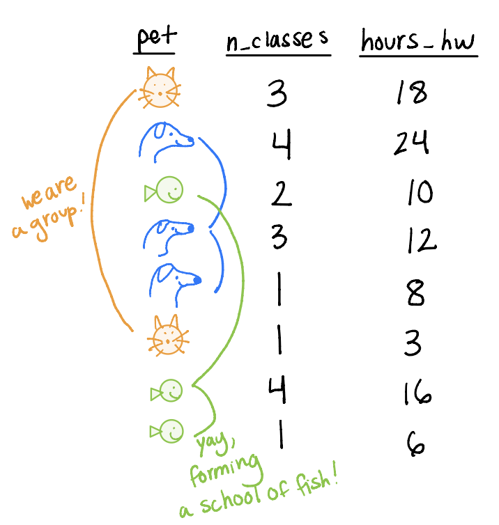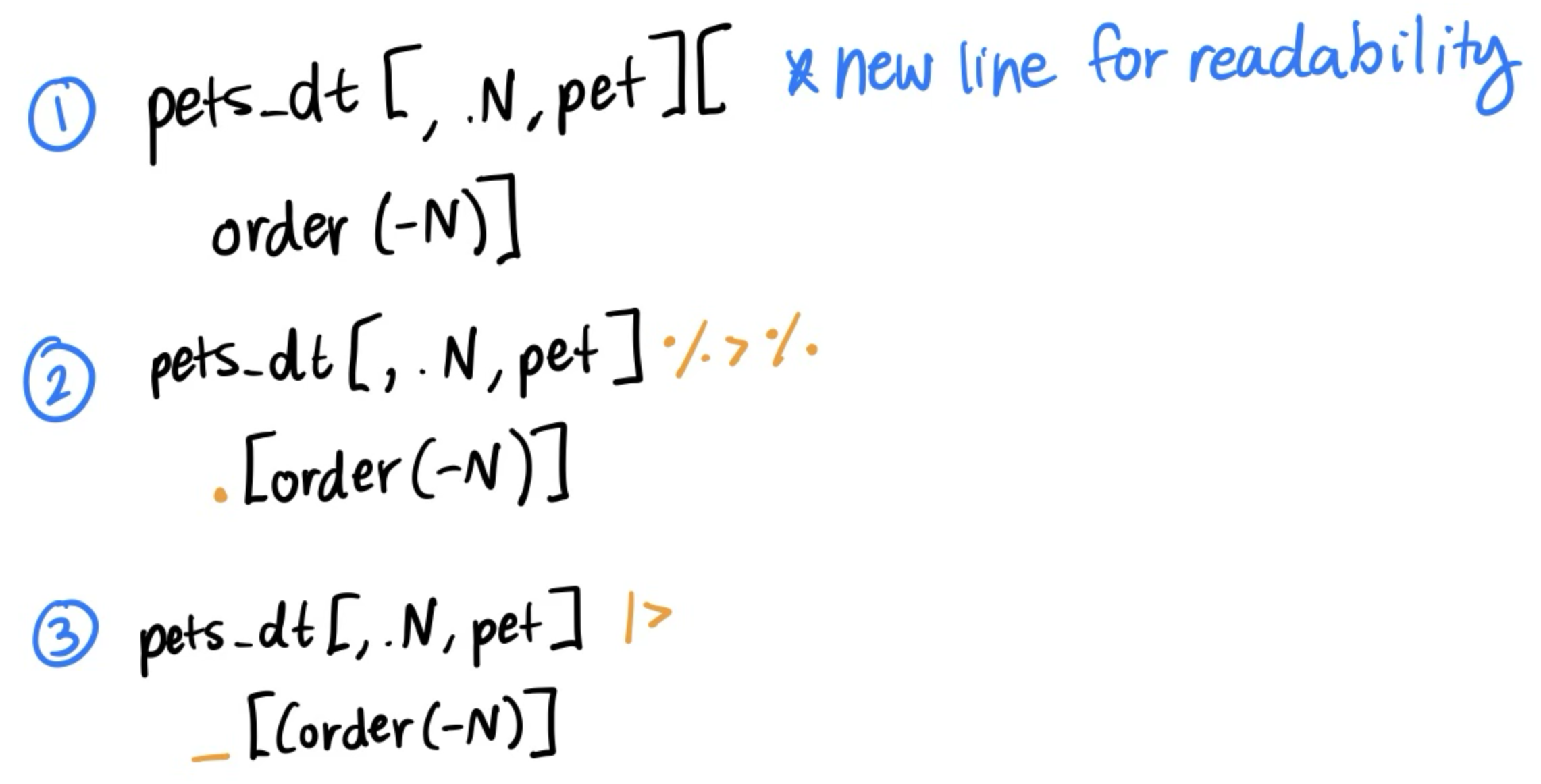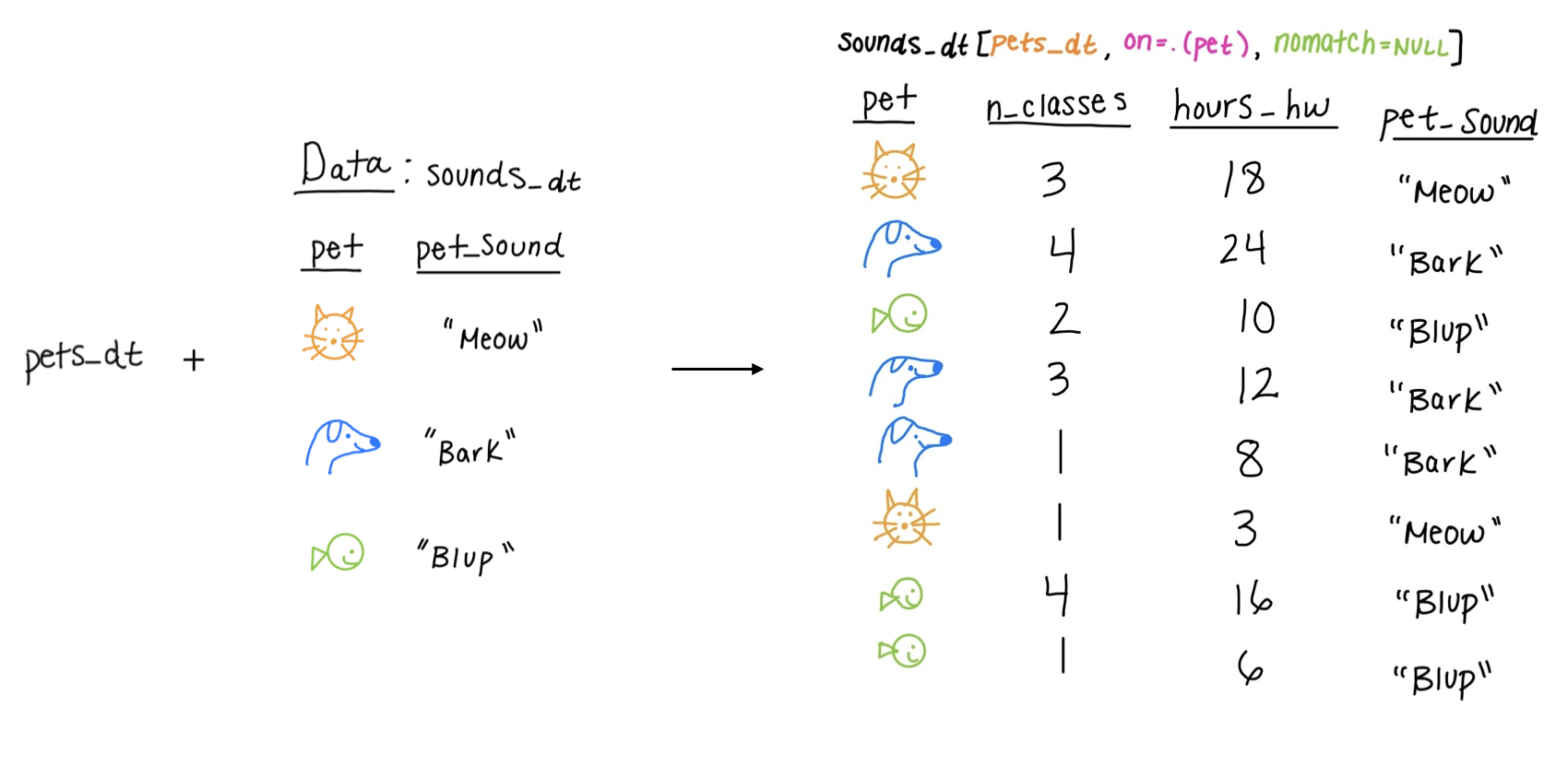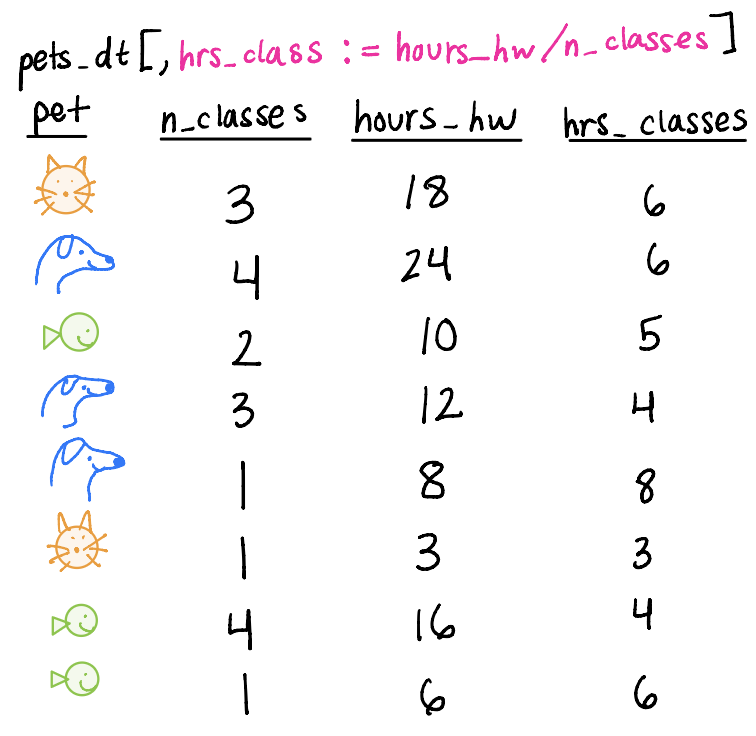 What if we wanted to pair multiple of the six main verbs together? For example, filter pets_dt to remove the cats and then arrange by hours_hw?