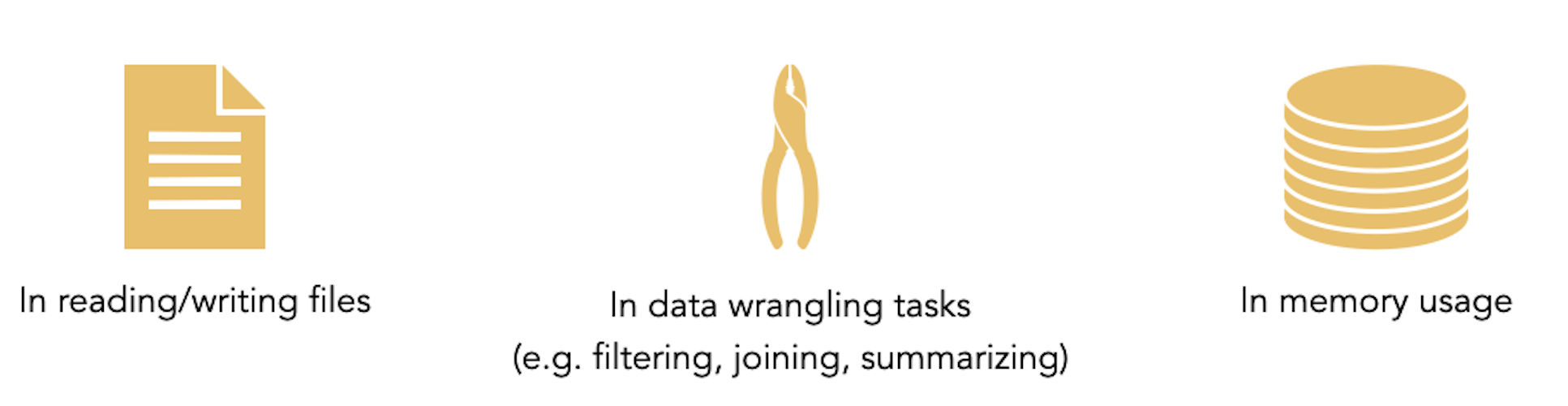Uses: data wrangling, reading/writing files, handling large data, and much more!