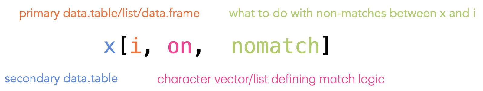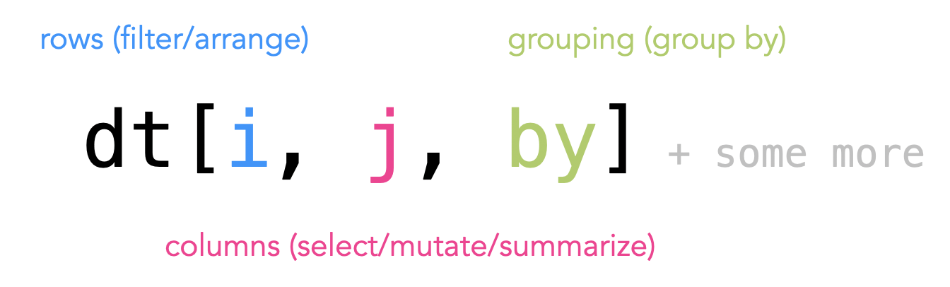 data.table syntaxThe six main verbs all follow a three part syntax: