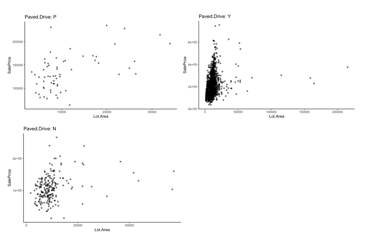 Let’s say we are investigating the relationship between lot area and sale price and we want to see how it varies by driveway pavement.